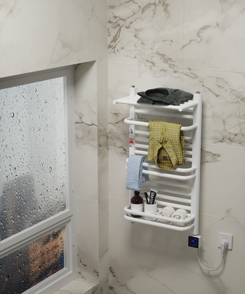 在較小浴室中,高功率電加熱毛巾架可兼顧局部取暖;